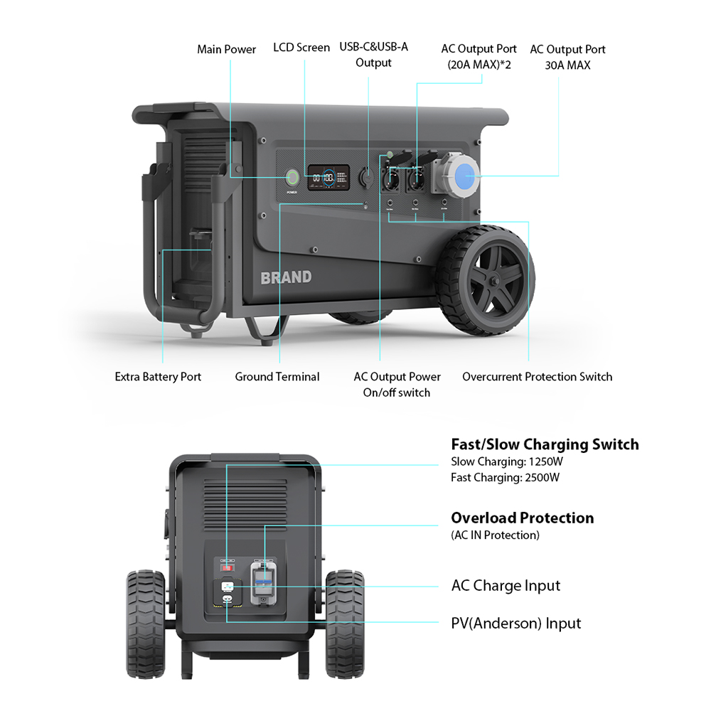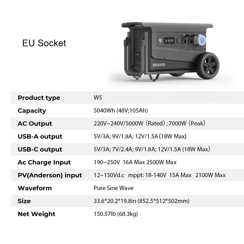 | Output | AC Output:100~120V/220~240V 5000W(Rated); 7000W(Peak) |